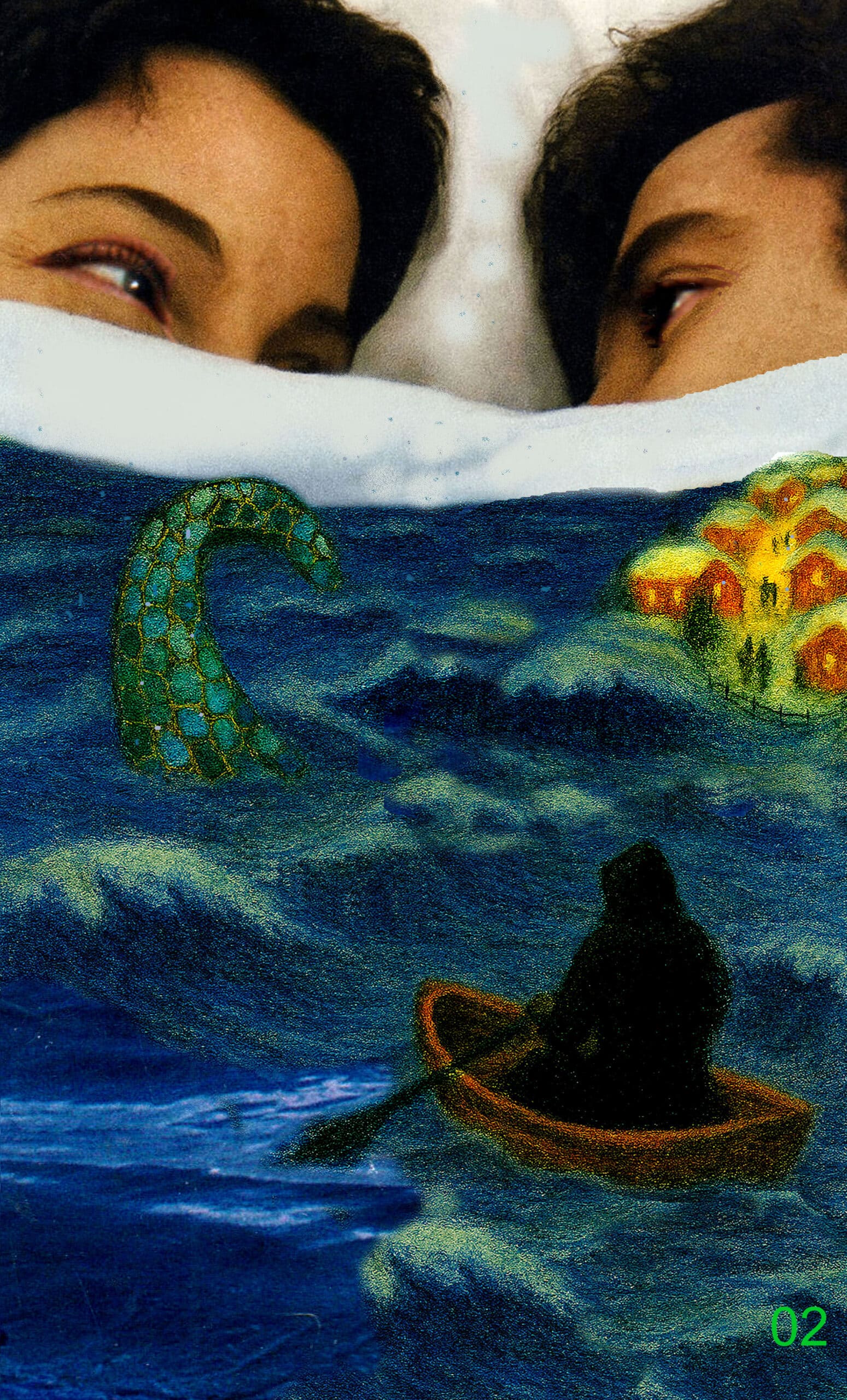 • Die Decke geht über in ein Meer – mit Wellen, Boot, Tentakel, leuchtenden Häusern.