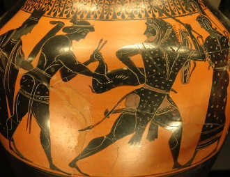 Herakles verfolgte den Eber Tag und Nacht. Schließlich brach das mächtige Tier vor Erschöpfung zusammen. So konnte sich der Held auch dieses Tier auf seine Schultern legen und zu Eurystheus bringen.